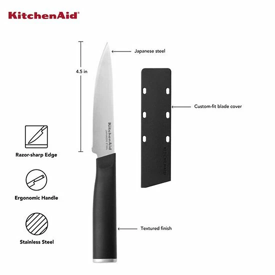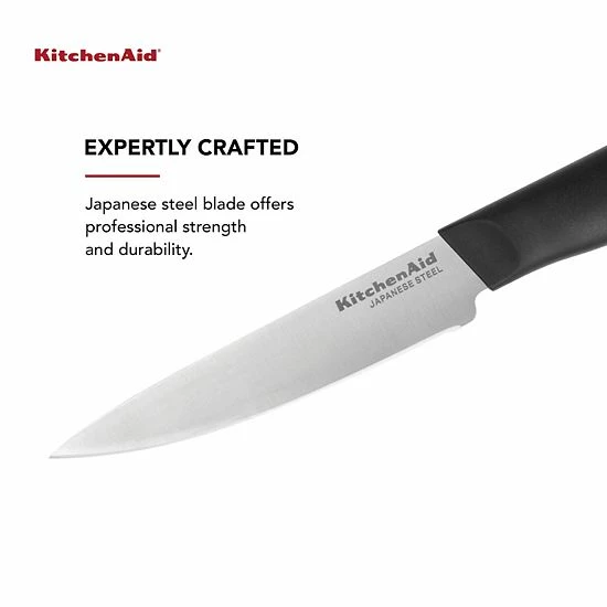 A food prep essential, this KitchenAid 4-1/2 Inch Utility Knife features a high-carbon imported Japanese steel blade hardened and tempered to provide a long lasting edge for a professional, quality cut every time.