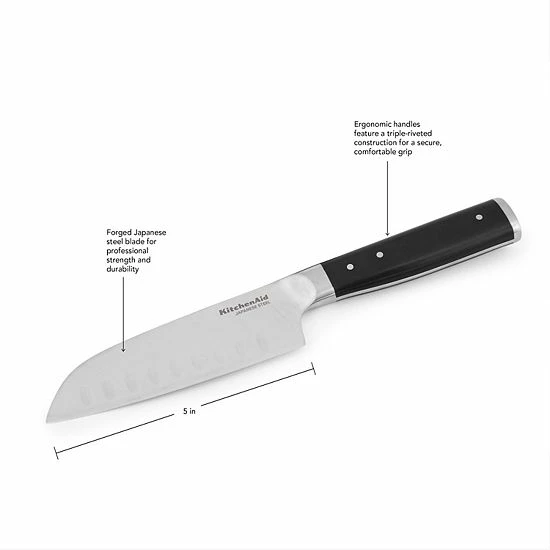 A versatile cutting essential, this KitchenAid 5-Inch Santoku Knife features a high-carbon imported Japanese steel blade hardened and tempered to provide a long lasting edge for a professional, quality cut every time.