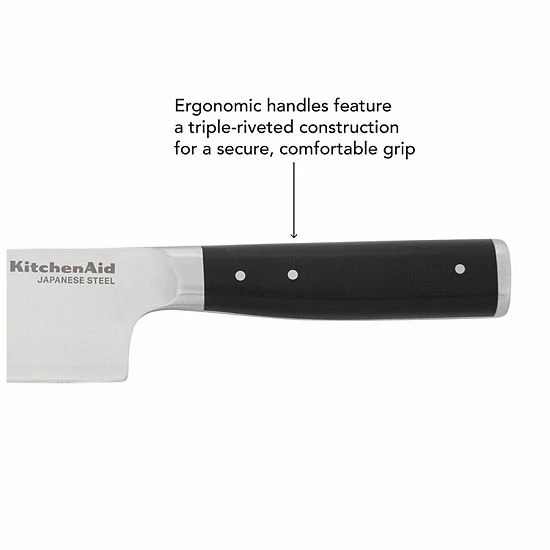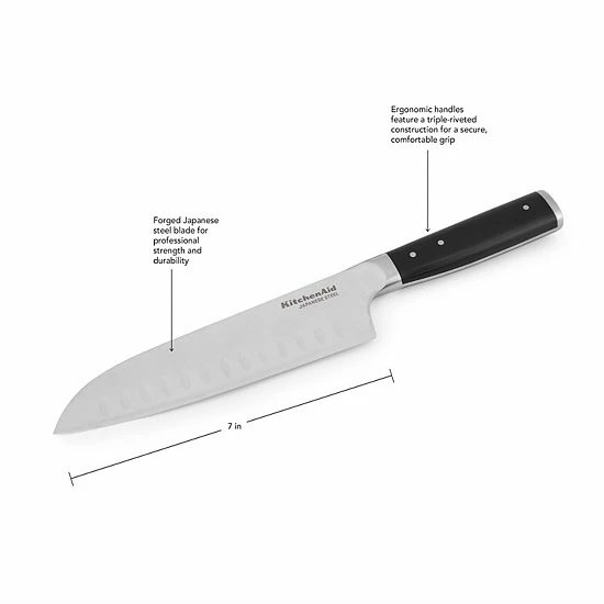 A versatile cutting essential, this KitchenAid 7-Inch Santoku Knife features a high-carbon, Japanese steel blade hardened and tempered to provide a long lasting edge for a professional, quality cut every time.